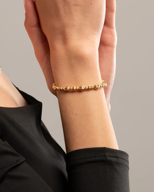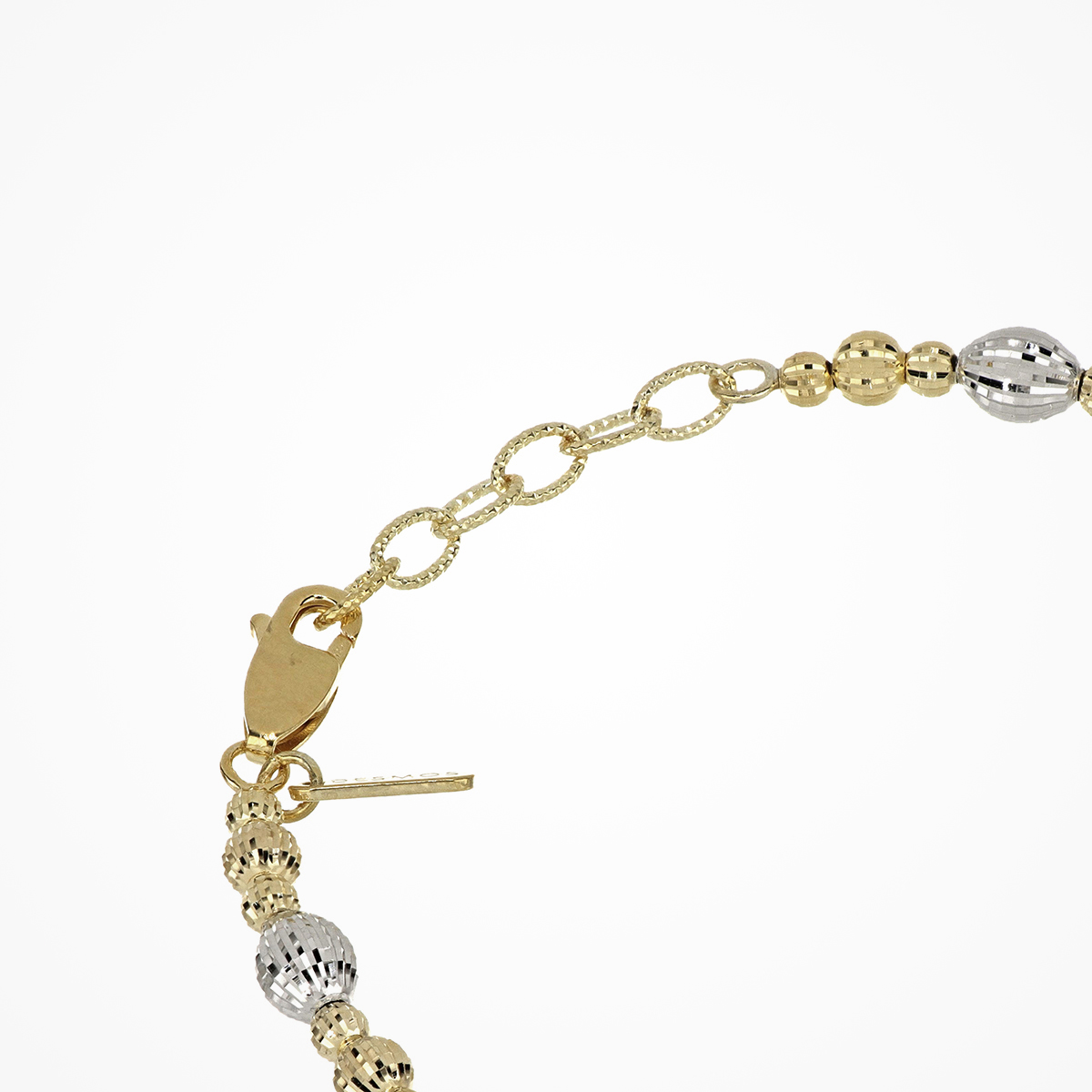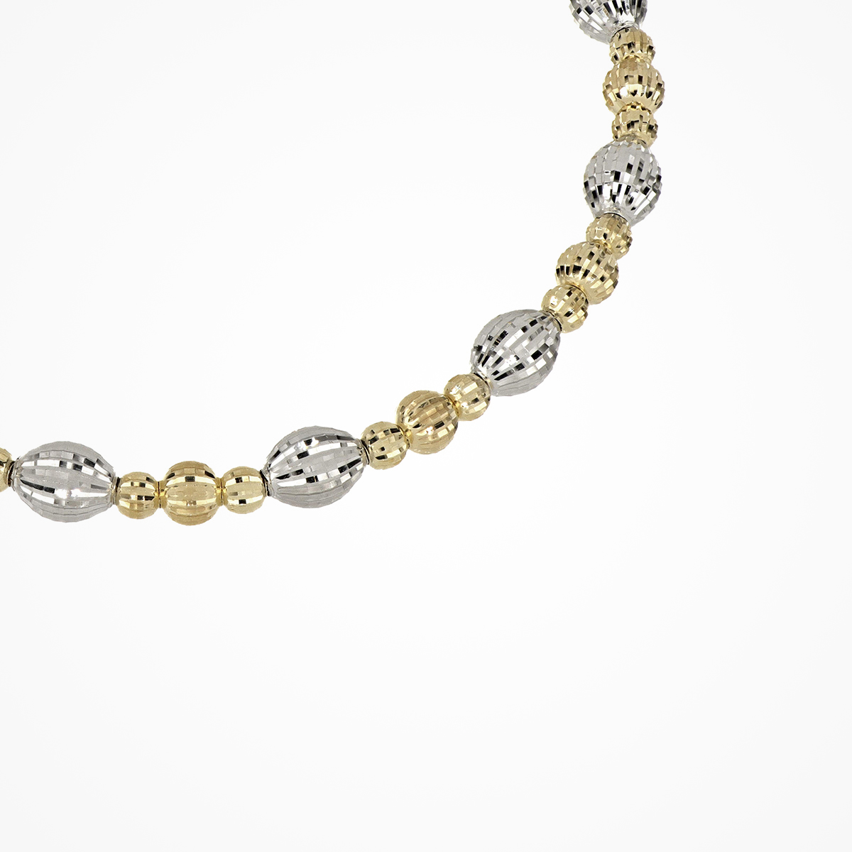 Bracciale in argento a palline infilate e diamantate. I tre elementi hanno forme diverse per creare un gioco di spessori e di luce.
