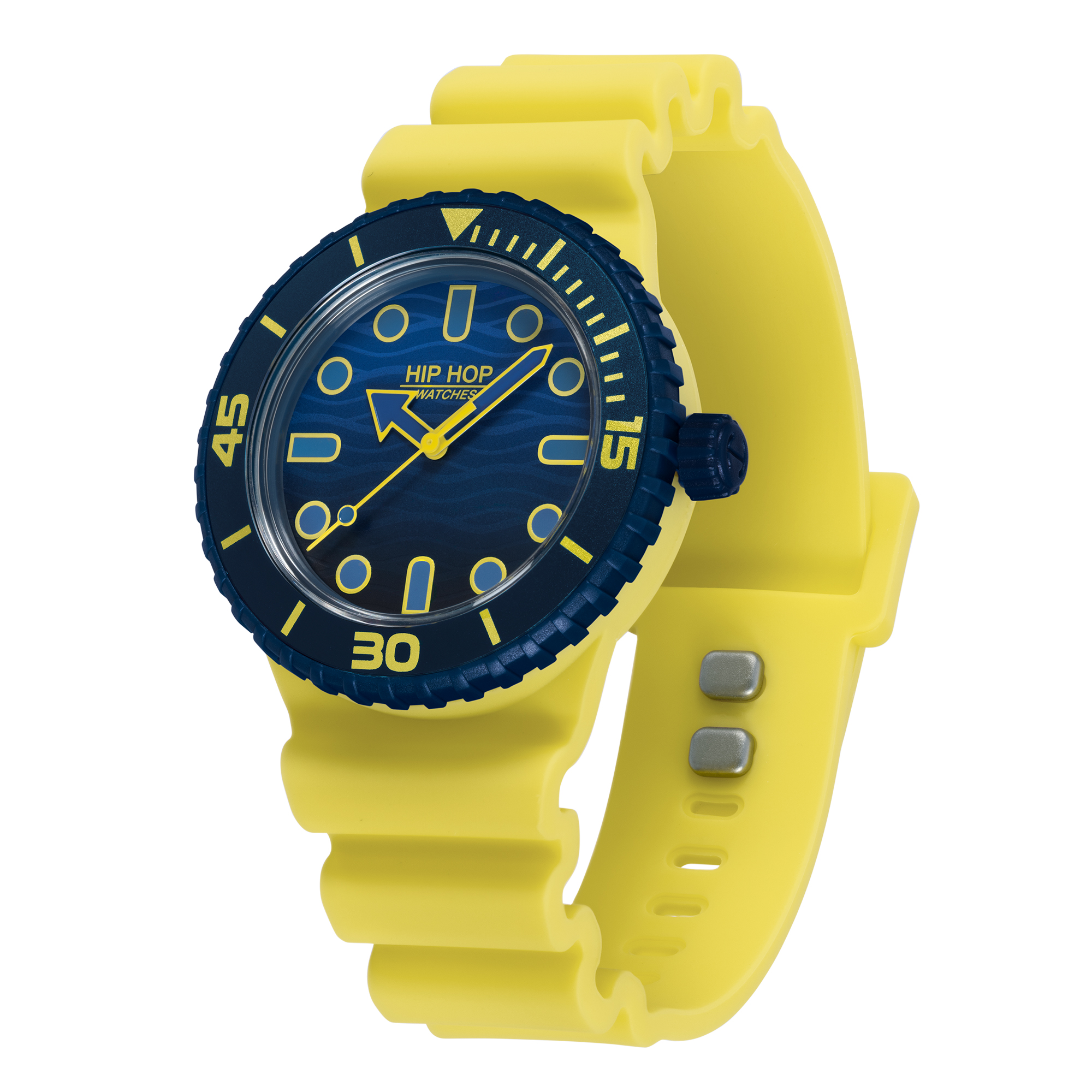 L’orologio Hip Hop Master è un mix perfetto di stile e praticità, adatto ad affrontare qualsiasi sfida quotidiana con energia e precisione. Il quadrante, dal pattern sfumato e ondulato sui toni del blu, è illuminato da indici e sfere con luminous giallo lime a contrasto. La lunetta girevole unidirezionale è caratterizzata da una sfumatura sui toni del blu, per un accostamento di carattere e stile. Il morbido cinturino in silicone semitrasparente blu ha la chiusura .DOT e ha impresso un dettaglio speciale: la Wind Speed, scala di conversione da metri al secondo a nodi per indicare la velocità del vento. L’orologio è venduto con un secondo cinturino intercambiabile in silicone color lime yellow per essere sempre intonati con il mood della giornata.
